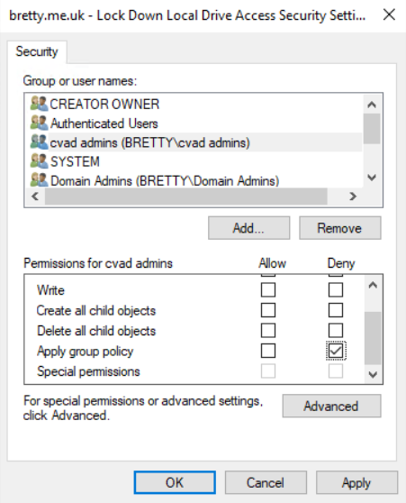Click on the GPO -> Delegation then click the Advanced button. Add your VDA Admin group in there and select “Deny” to apply the group policy. That’s it – this will not apply to your Administrators now.