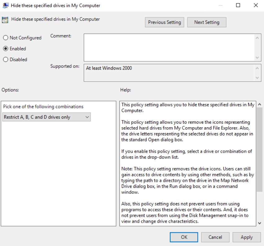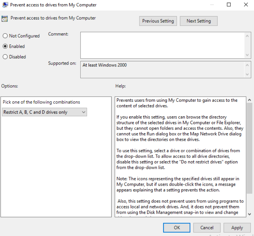 Click on OK then open up the setting “Prevent access to drives from My Computer”, enable that and set the same drives as you did in the previous setting
