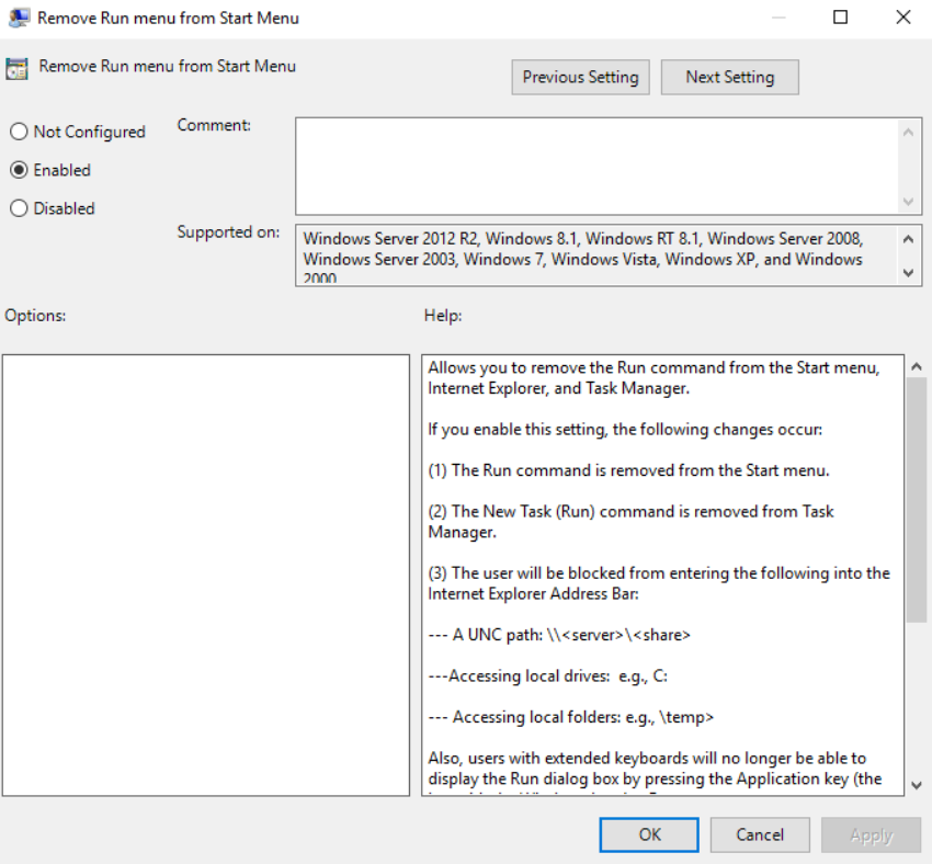 Open up your GPO and go to User Configuration -> Policies -> Administrative Templates -> Start Menu and Taskbar. Then open up the “Remove Run menu from Start Menu” setting and enable it