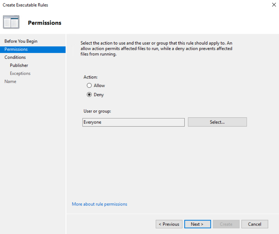 Make sure you have created the default rules to allow Windows to operate then right click and create a new rule. Click next and select “Deny” for everyone