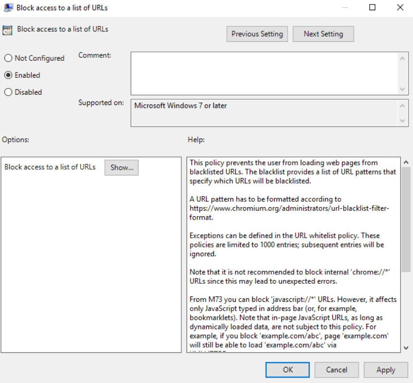 Open up your GPO and make sure you have added the Google Chrome ADMX templates. Navigate to Computer Configuration -> Policies -> Administrative Templates -> Google Chrome and open up the setting “Block access to a list of URL’s”. Enable that and click the “Show” button to add the URL’s