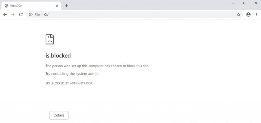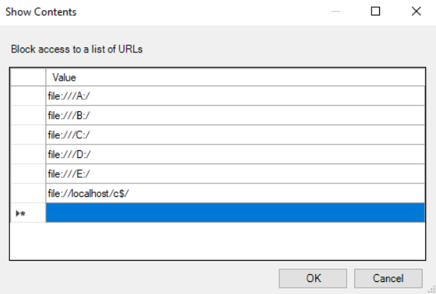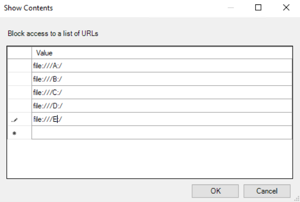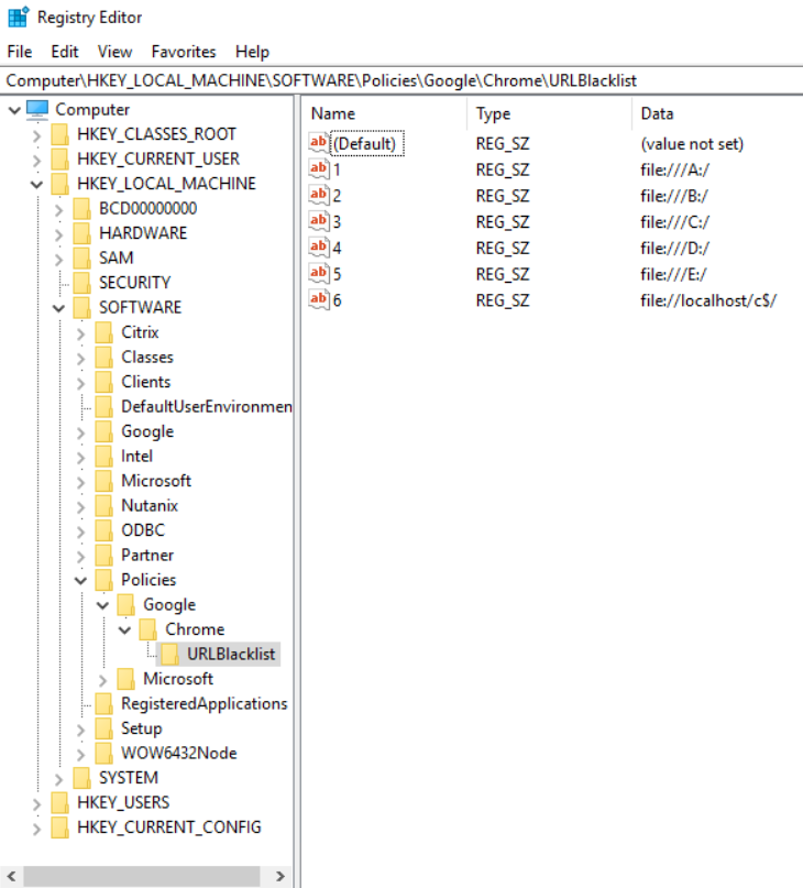 In short, this was something that I could not block using the Chrome URL Blacklist. I am not sure why it’s not working as local drives work fine but the loopback address and localhost would always allow to be to get to the local drives.
