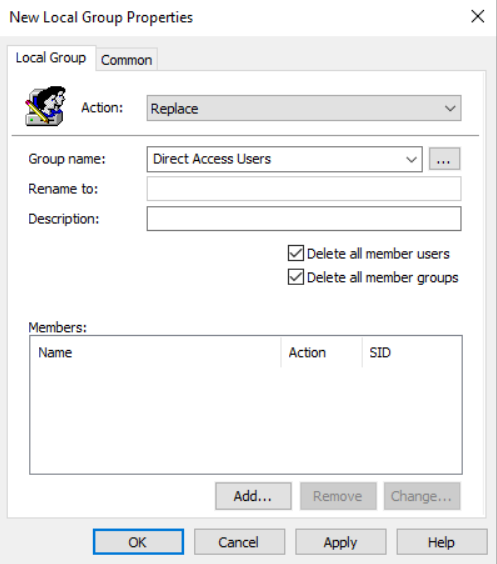 Select Replace, name the group “Direct Access Users” and select to remove all users and groups from this local group