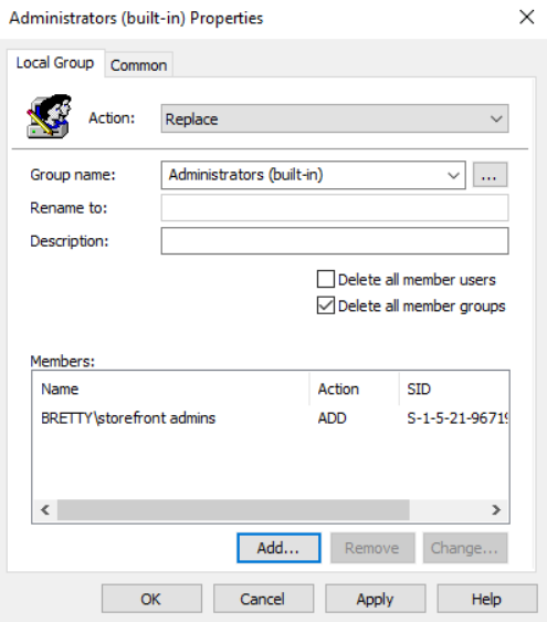 We will deal with StoreFront initially. Right Click and create a new Local Group. Select “Replace” for the action, pick “Administrators (built-in) as the Group Name. Tick the box “Delete all member groups” and add your new StoreFront group to the Members section.