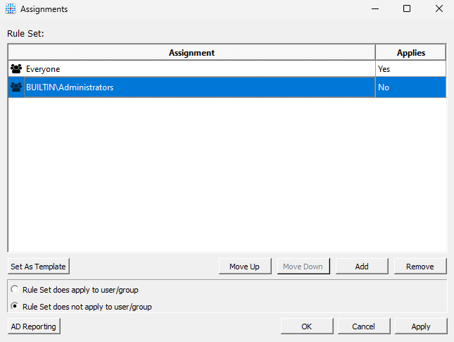 Select to “Rule set does apply to user/group” for Everyone and add Administrators as a group, selecting “Rule set does not apply to user/group”.