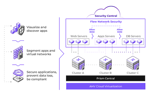 Flow Network Security delivers advanced networking and security services for AHV VMs, providing visibility into the virtual network, application-centric protection from network threats, and automation of common networking operations.
